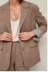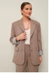 Жакет актуального полуприлегающего силуэта, с центральной застежкой на петли и пуговицы. Воротник пиджачного типа с отложными лацканами. Спереди обработаны прорезные карманы в рамку с клапанами. Рукава втачные двухшовные со шлицей и отделочной подкладкой.