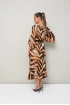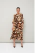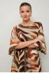 Платье отрезное по линии талии на резинке, выполнено из вискозы с абстрактным принтом. Горловина с окантованным вырезом круглой формы. Рукава-реглан, в длине 3/4 собраны на резинку по низу. По спинке обработан разрез с застежкой в среднем шве на навесную петлю и пуговицу. В комплекте прилагается съемный ремень.