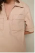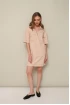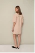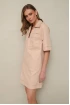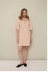 Платье прямого силуэта в длине мини, выполнено из джинсовой ткани. Отложной воротник с фигурным вырезом горловины. Рукава втачные короткие. Спереди накладные нагрудные карманы. В боковых швах внутренние карманы. Спинка с отрезной кокеткой. Верхняя часть карманов, низ рукавов и платья обработаны широкой подгибкой.