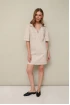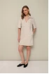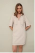 Платье прямого силуэта в длине мини, выполнено из джинсовой ткани. Отложной воротник с фигурным вырезом горловины. Рукава втачные короткие. Спереди накладные нагрудные карманы. В боковых швах внутренние карманы. Спинка с отрезной кокеткой. Верхняя часть карманов, низ рукавов и платья обработаны широкой подгибкой.
