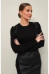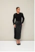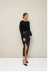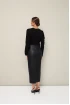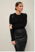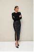 Стильное платье прилегающего силуэта, отрезное по линии талии, выполнено из экокожи и трикотажного полотна. Горловина округлой формы. Длинные втачные рукава. Юбка спереди с подрезом на металлическую молнию, с возможностью регулировать высоту разреза. Застёжка по спинке в среднем шве на потайную молнию.