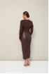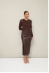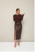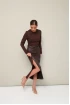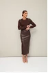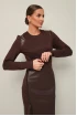 Стильное платье прилегающего силуэта, отрезное по линии талии, выполнено из экокожи и трикотажного полотна. Горловина округлой формы. Длинные втачные рукава. Юбка спереди с подрезом на металлическую молнию, с возможностью регулировать высоту разреза. Застёжка по спинке в среднем шве на потайную молнию.