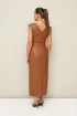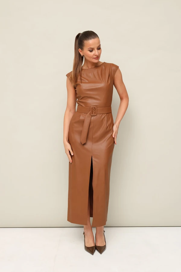 Стильное платье отрезное по линии талии в длине миди, выполнено из экокожи. Округлый вырез горловины. По плечевым швам лифа и по талии обработаны защипы. Юбка со средним швом, переходящим в разрез. Спинка в V-образным вырезом. В среднем шве застёжка на потайную тесьму молнию. В комплекте прилагается пояс из основной ткани с обтяжной пряжкой.