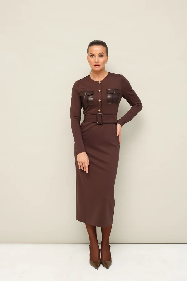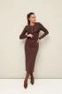 Платье прилегающего силуэта, отрезное по линии талии, выполнено из эластичного трикотажного полотна.