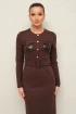Горловина округлой формы. По лифу обработана планка с пуговицами и нагрудные накладные карманы с клапанами. Длинные втачные рукава. Спинка с застежкой на потайную молнию в среднем шве. Для удобства движения сзади обработан разрез.