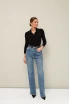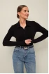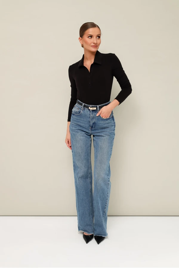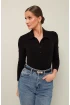 Трикотажное поло с отложным воротником с цельнокроеной стойкой. Вырез горловины обработан притачными планками с застежкой на петли и пуговицы. Втачные длинные рукава.