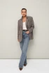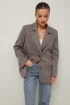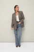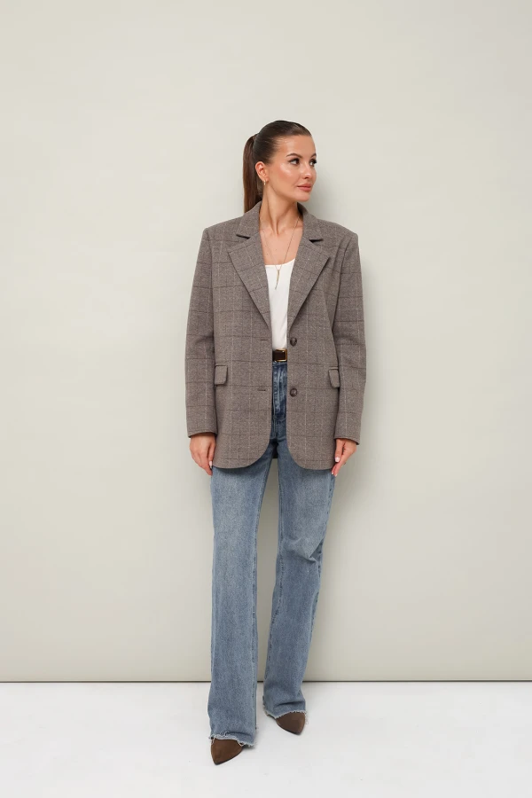 Жакет актуального прямого кроя, выполнен из костюмной ткани. Воротник пиджачного типа с отложными лацканами, край борта скругленный по низу жакета. Спереди обработаны прорезные карманы в рамку с клапанами. Рукава втачные двухшовные со шлицей и пуговицами. Спинка со средним швом, переходящим в высокую шлицу с застежкой на петли и пуговицы. Жакет на подкладке.